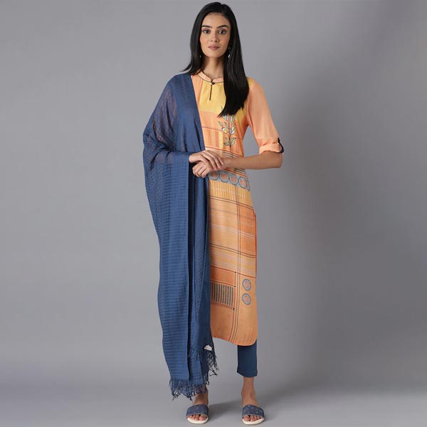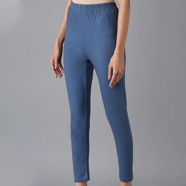 A pair of blue mid-rise ankle length leggings, has an elasticated waistband with slip-on closure